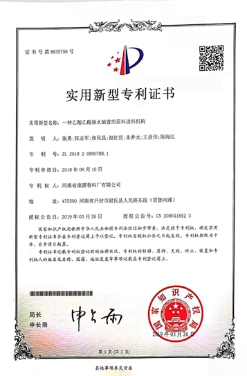 河南省康源香料廠有限公司坐落于尉氏人民路東段(賈魯河灘),是生產經營食用香精香料、食品添加劑、精細化工產品生產銷售的企業,統一社會信用代碼:91410223799151685B,公司成立于1997年,注冊資金850萬元,廠區占地面積14300平方米,廠房建筑面積13600平方米,現有企業員工186人,其中擁有高、中級職稱技術人員48人,主要生產銷售產品有:食品添加劑(己酸乙酯、乳酸乙酯、丙酸乙酯、異丁酸乙酯、丁酸乙酯、 乙酸乙酯、庚酸乙酯乙酸異戊酯、辛酸乙酯、乙酸丙酯、苯乙醇、2,3丁二酮、冰乙酸(低壓羰基化法)、乳酸、己酸、丁酸、丙酸、乙縮醛、甘油、己酸烯丙酯、庚酸烯丙酯),食品用香精(食品用香精-液體),復配食品添加劑(復配酒類增味劑)實際綜合生產能力達到3萬噸/年,固定資產2810萬元,總資產13200萬元。